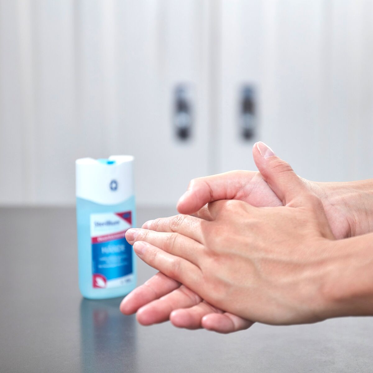 Die Hände sind mit über 80% der Überträger Nr. 1 von Keimen und Viren. Daher desinfizieren Sie Ihre Hände regelmäßig, gerade nach der Pflege. Vergessen Sie nicht die Dinge, die Sie regelmäßig anfassen z.B. Türgriffe, Toilettendeckel/Brille etc. mit einem geeigneten Flächendesinfektionsmittel zu reinigen. Besonders geeignet hierfür z.B. Sterillium Protect & Care Tissues. Die vorgetränkten Desinfektionstücher im praktischen Spender können Sie auf allen –auch empfindlichen– Oberflächen bedenkenlos reinigen.